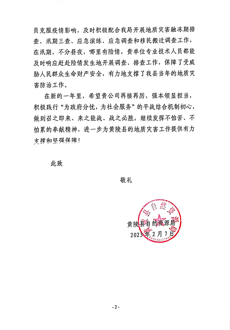 一封感謝信,紙短情長。2月17日,陜西工勘院收到一封來自黃陵縣自然資源局送來的感謝信,這對公司平戰(zhàn)結(jié)合技術(shù)支撐組各位成員來說既是“意外驚喜”又在“意料之中”,是對我公司平戰(zhàn)結(jié)合技術(shù)支撐工作的認(rèn)可,更是對公司地質(zhì)災(zāi)害防治領(lǐng)域技術(shù)實(shí)力的肯定。